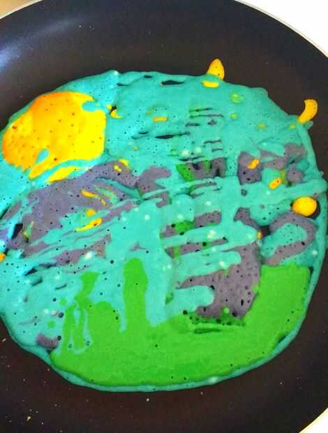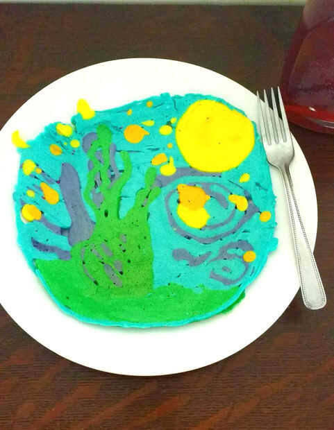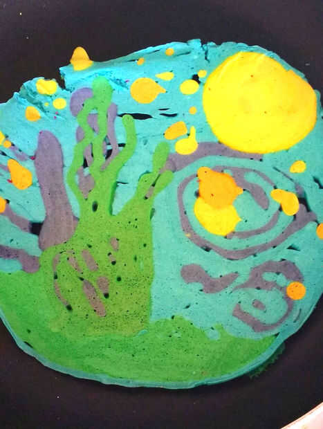 Por otro panqueque, me inspiré por Vincent van Gogh, "Noche estrellada". Por desgracia, no tengo suficientes botellas de condimentos para hacer más colores y más detalles (pero tal vez será mi próximo gran proyecto?).