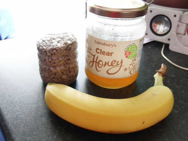 También, utilice este tiempo para agarrar sus ingredientes. Hoy he elegido plátano, semillas de girasol, miel y canela. Delicioso!