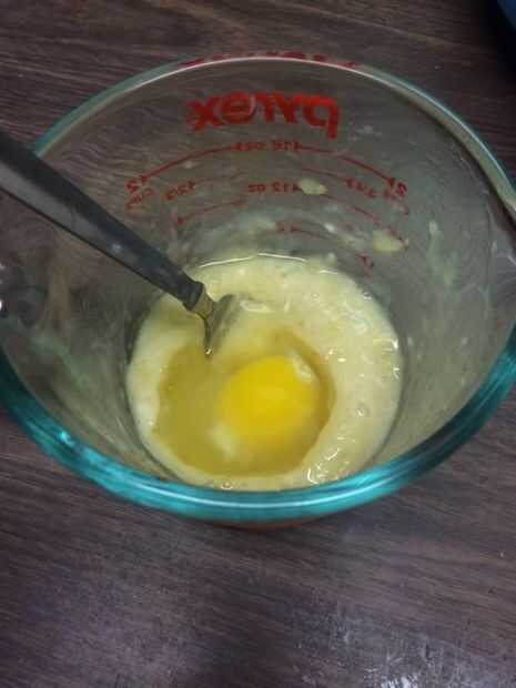 Romper el huevo en el puré plátano y revuelva hasta que totalmente combinado.