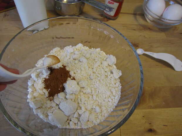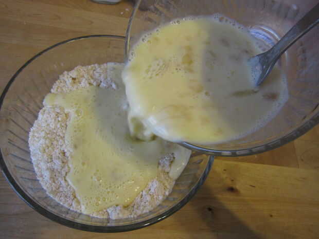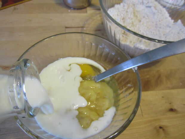 En un segundo tazón, mezclar los huevos, la leche y el puré de plátano.