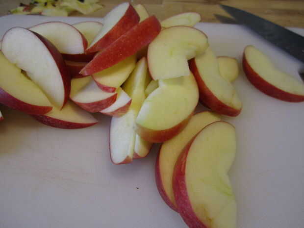 Lavar las manzanas de la base, cortar en rodajas y reservar.