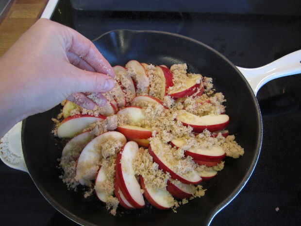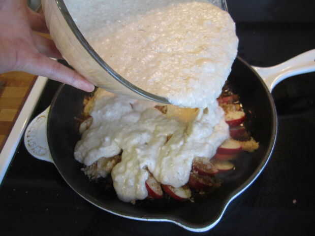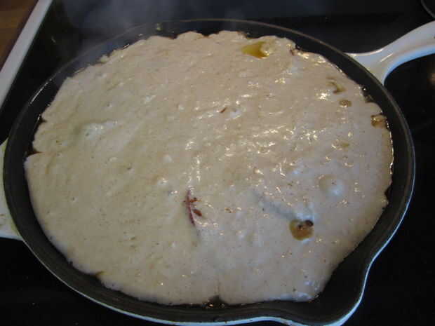Suavemente vierta los crepes preparados sobre las manzanas, permitiendo que ésta se extienda a los bordes de la cacerola. Deje que la crepe de cocinar en la estufa durante unos minutos más, hasta que las burbujas de azúcar morena para arriba por el batter y respiraderos poco arrojando vapor. El panqueque está ahora listo para entrar en el horno.