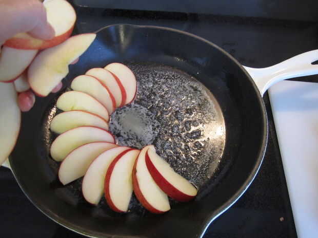 Coloque cuidadosamente las rebanadas de manzana en el fondo de la cacerola en un círculo - esto es importante porque desea que la parte superior de la crepe para lucir bien cuando volcó más adelante.