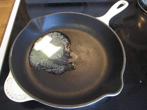 Coloque el recipiente de hierro fundido a fuego medio y derretir la mantequilla en la sartén. No se olvide de remolino alrededor para cubrir correctamente la bandeja entera.
