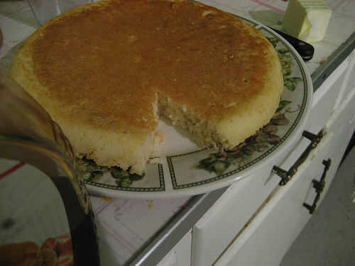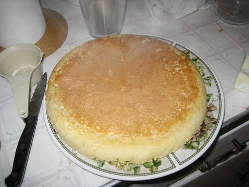 Una vez hecho, sacar la bandeja del horno, con un guante de horno. Usted se va directamente de la sartén a un plato, así destreza es algo vital. Coloque la placa boca abajo encima de la bandeja y gire el conjunto placa de pan juntos para que la olla está boca abajo encima de la placa. Si todo va según el plan, la crepe gigante caerá sobre la placa con un mínimo de alboroto. Si no, un tenedor, o un par de toques rápidos para hacerlo perder. Esperemos que acabará buscando algo como la imagen de abajo.