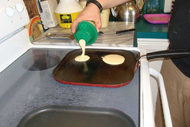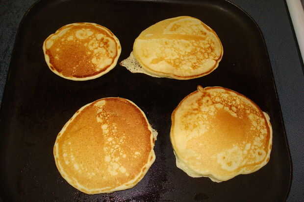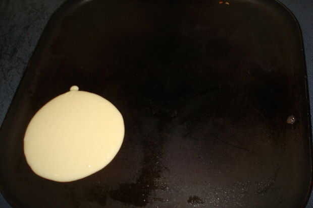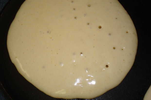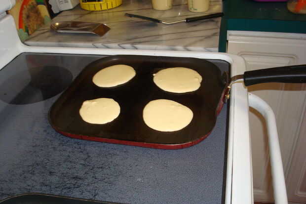 Vierta la mezcla sobre la sartén en círculos de 3-4". Deje que cocine hasta que las burbujas comienzan a mostrar en la parte superior, en cuanto es agradable y burbujas, darle la vuelta. Debe tener un lado muy bien dorado si usted tiempo derecho (tarda un poco de práctica para obtener los aspecto perfectos, pero como no son negros, son finos). Cocinar en este lado hasta que estén dorados. De la pila en la placa y servir tan pronto como usted tiene 8-10 hecho (más caliente y fresco es mucho mejores)