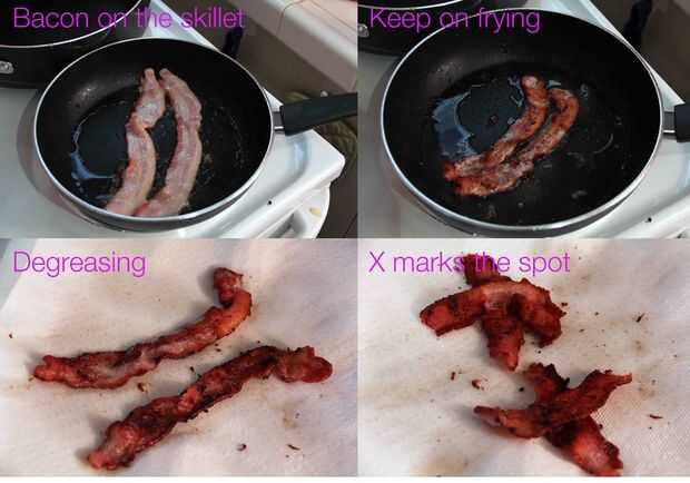 Cocinar el tocino todo delicioso, sino que no cocine demasiado, que se colocará en el bateador más tarde, donde se aplicará calor untuoso, más quebradizo a través la carne de cerdo.