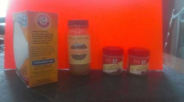 Tamizar 1/2 cucharadita (CDA) de molida, 1/2 cucharadita (CDA) de nuez moscada molida y 1 cucharadita de canela en el bol para mezclar.