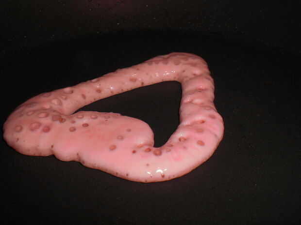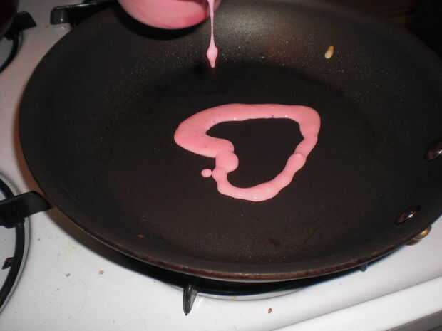 ahora, si tienes pasta rosa, esto es donde la utilizas. Si no, esto seguirá funcionando, pero su corazón no será color de rosa y en cambio será un color más oscuro que el resto de la crepe. Vierta el contorno de un corazón en su cacerola y espere unos segundos para la mezcla a cocinar. quiere ser muy solidificado o bien se Haz manchado alrededor cuando viertes el resto de su masa. Si usted está haciendo panqueques grandes podrían verter las iniciales de tu persona especial, pero sólo va pegar con el corazón simple.