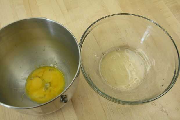 1. separar las claras de las yemas de huevo en dos limpio de vidrio o tazas de metal.