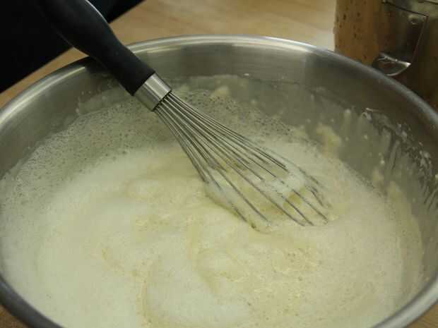 2. batir las claras de huevo con una batidora eléctrica hasta que son capaces de mantener un pico rígido.