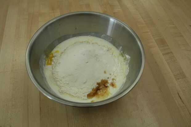 3. mezclar la harina, polvo de hornear, sal, bicarbonato de sodio, azúcar, vainilla, yemas de huevo y la mantequilla. Batir hasta que quede suave.