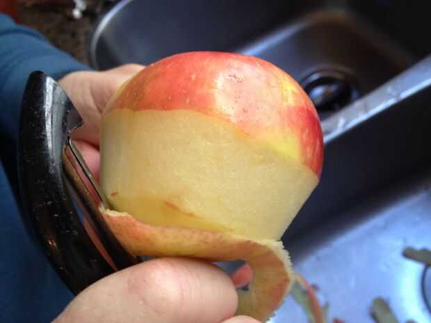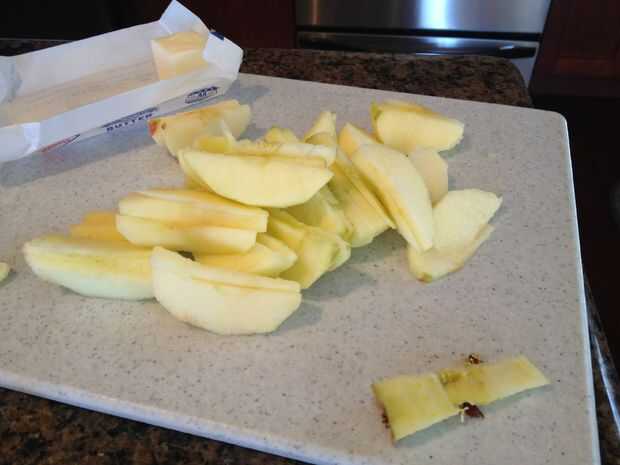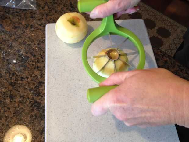 Use un cuchillo para la base y pelar las manzanas. Luego, cortar en rodajas (cuarto a media pulgada de espesor). Navaja de mango con extrema precaución.