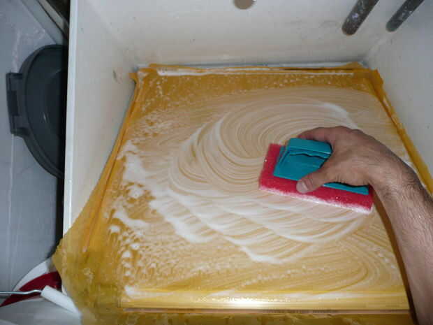 - Lave la pantalla completamente con cualquier jabón desengrasante. Plato jabón funciona bien.
