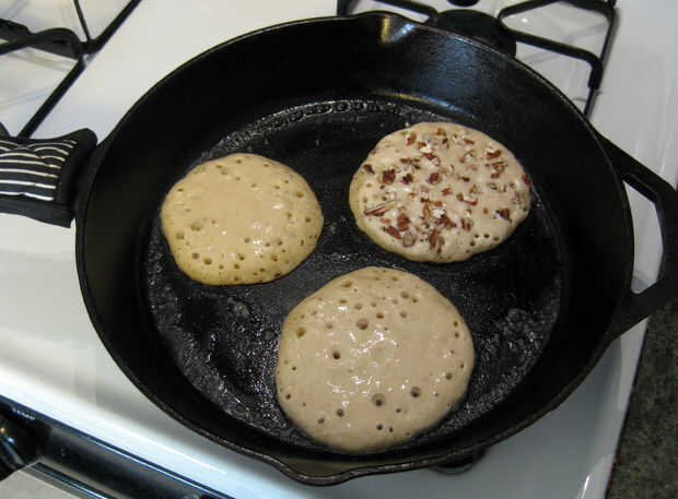 Estás tan cerca de exquisitez maravillosa ahora! Calentar su sartén, plancha, puerta de coche, peto de armadura u otra superficie caliente con la estufa, parrilla, soplete, muerte de Archimedes-ray u otra fuente de calor. Poner algún aceite o mantequilla en él, espere hasta que chisporrotee un poco y vierta alguna masa en la forma áspera de un panqueque (no pienses demasiado acerca de la forma, usted podrá estropear). Añadir nueces si quieres (no si no).
