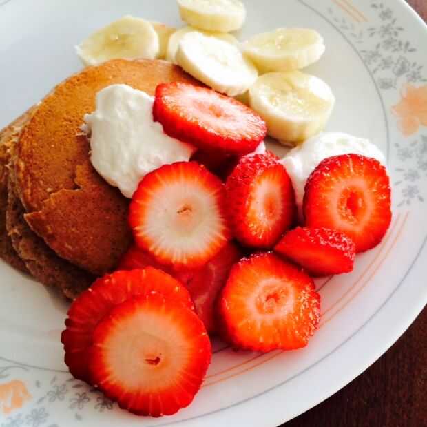 Panqueques de proteína de vainilla con fresas y plátanos (10 / 10 paso)