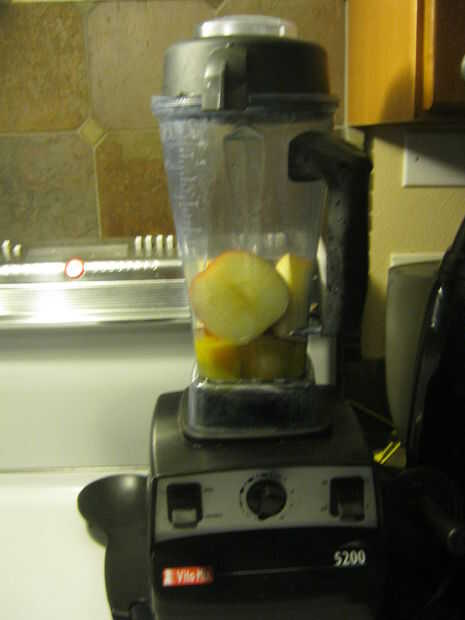 El siguiente paso es aún más fácil, tiro todo en la licuadora.  Cortar la base de la manzana, pero eso es sólo nosotros.