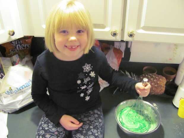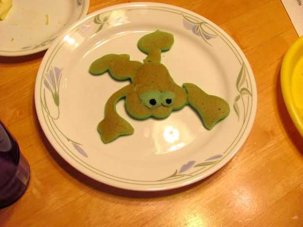 Los ojos de la rana se realizaron colocando dos gotas de la mezcla encima de los panqueques cocidos y les flipando sobre cocinar un poco para la firma para arriba, pero no cocine lo suficiente como para dar vuelta a marrón. Los alumnos crearon con colocando un toque de colorante verde directamente desde el frasco cuentagotas en el centro de cada ojo.
