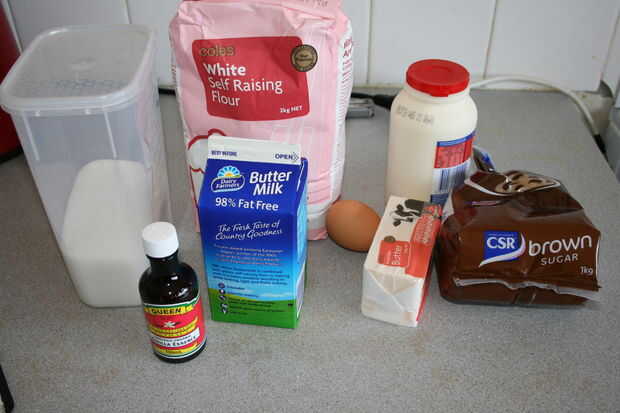 Ingredientes-9 7/8 onzas de harina1 cucharadita de bicarbonato de sodio2 cucharaditas de polvo para hornear4 cucharadas de azúcar1/2 cucharadita de sal2 huevos (batidos)600 ml de suero de leche1 cucharadita de extracto de vainilla1 3/4 onzas de mante