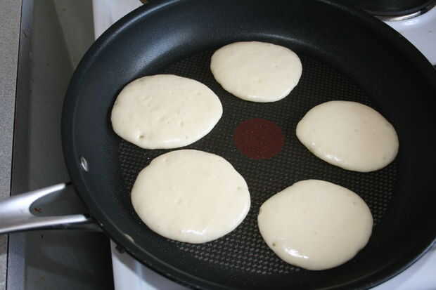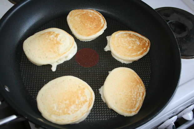 Poner cucharadas de la mezcla de panqueques en la sartén, dejarlos cocinar hasta que las burbujas comiencen formando en la parte superior, una vez que hay unas burbujas, voltearlas y cocer la misma cantidad de tiempo en el otro lado.