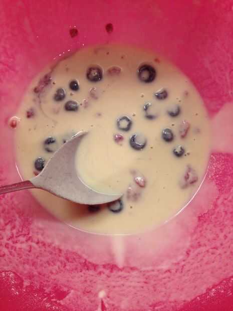 Empezar mezclando la harina y la levadura en un bol grande, añadimos el huevo y la leche. Batir todo hasta que forman una masa agradable (puede Agregar arándanos y frambuesas en esta etapa).