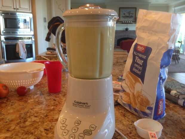 Crack 3 huevos en la batidora y verter en la leche, mezclarlo durante unos treinta segundos o hasta que se mezcle bien. Agregue la sal y la harina y mezcla todo junto hasta que esté burbujeando.