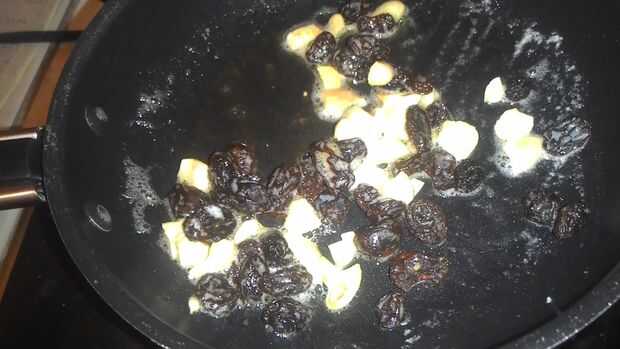 1. Calentar sartén y freír las nueces de acajú picadas. Cuando se torne dorada, agregar las pasas de uva y freír durante 30 segundos