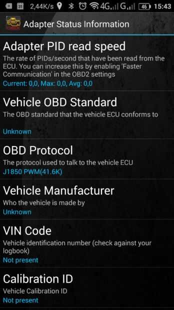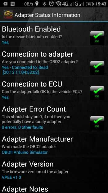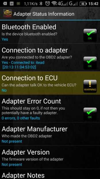 Próxima puesta en marcha par, vaya a configuración, configuración del adaptador de OBD2 y elegir el dispositivo de Bluetooth. Aquí seleccione el nombre del adaptador bluetooth. Asegúrese de que se apaga la comunicación más rápida. Continuación, vaya a la pantalla de inicio de esfuerzo de torsión y seleccione estado del adaptador. Los primeros 4 debe ir verde y ok. Puede tomar hasta 10-15 segundos. Si no, buena suerte con él: P después de muchos errores par intenta restablecer la conexión automáticamente.