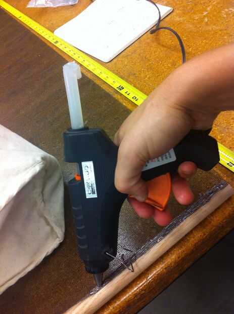 (Se pasó a pegamento en la pistola de pegamento, pero no siempre cuentan con que hay. Cualquier tienda de artesanía tendrá recambios de pegamento)