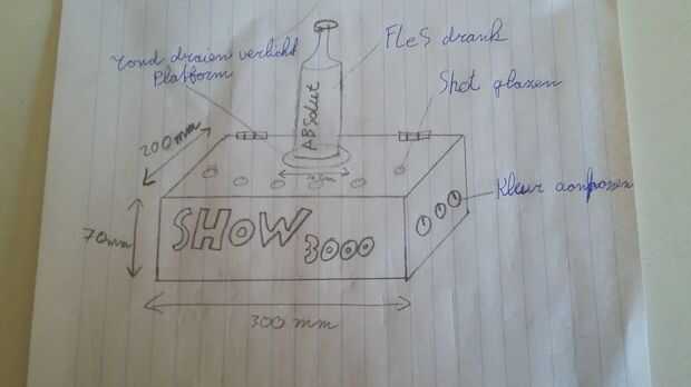La idea de una exhibición de la botella es debido a un proyecto escolar. Para el proyecto tenemos que hacer algo con un cortador láser, una impresora 3d y una bisagra. Después buscando idea en instructables y thingiverse llegué con la idea de hacer la botella de la exhibición. Hice un boceto que se muestra arriba. Con el potentionmeters en el sitio adecuado puede cambiar el collor de los leds en la placa. Para actualizar el proyecto usted puede programar el arduino lo wil jugar un espectáculo de luces.