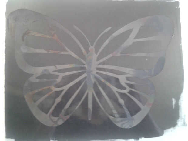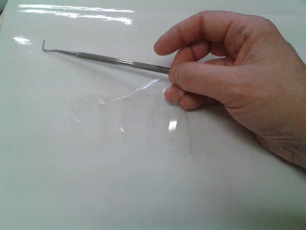 Una vez que ha cortado el vinilo, desmalezar cuidadosamente el vinilo de zonas 'void', es decir, las áreas que desea que la pintura penetre a través de su pantalla. Hay herramientas especiales que se puede utilizar para hacer esto, usted puede hacer su propia utilizando una aguja y un corcho, o puede utilizar una herramienta de gancho punta de prueba, que es lo que usé. Usted necesitará tener cuidado de no desplazar partes del vinilo si es posible. Esto habría sido mucho más fácil demostrar si nosotros no habíamos estado utilizando vinilo transparente! He mostrado una imagen de nuestra pantalla después de que la tinta fue utilizada, fuera de secuencia, para que pueda ver las áreas de vinilo.