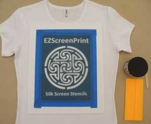 Posición EZScreenPrint serigrafía Stencil en la camiseta. Utilice un marco de plástico para la impresión de múltiples o de impedir que la tinta va en la camiseta. Fije la plantilla al marco de plástico con cinta.
