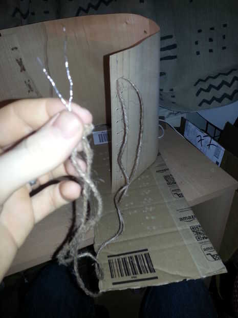 Cruz mina había cosido pero podría coser en cualquier estilo que desee. Puse mi "hilo" a través de los 2 primeros orificios y obtuvieron longitud incluso antes de salir a través de la segunda parte de laminado y trabajando hacia abajo cruzando el frente y la espalda hasta hasta el final y me ató firmemente.