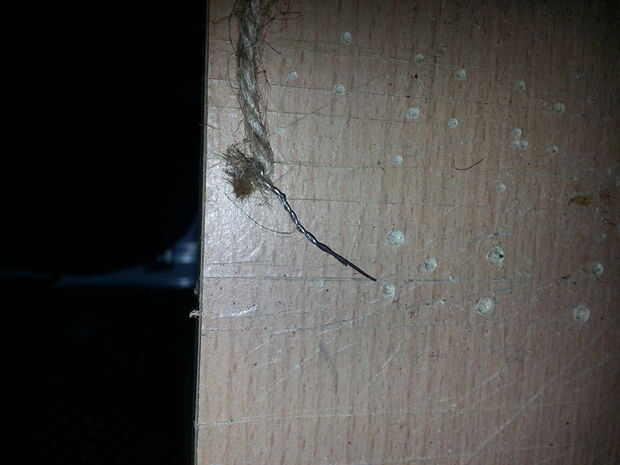 Y por último coser, encontré la forma más sencilla de hacerlo es hacer unas "agujas" de alambre que lo hice doblar el alambre sobre la cadena el giro al final esto guarda la cadena de desentrañar y le da algo rígida en el orificio...