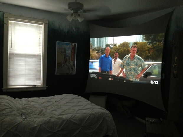 He tenido 5 diferentes teatros en casa en mi vida. Todo lo cual he hecho pantallas. He hecho también pantallas para miembro de la familia y amigos. He probado más de 40 pantallas diferentes y materiales de la pantalla. Se trata de un instructables en mis compilaciones más recientes de pantalla. Os muestro 3 maneras diferentes de configurar la pantalla. (La que se muestra arriba es el tramo de cuatro esquinas)