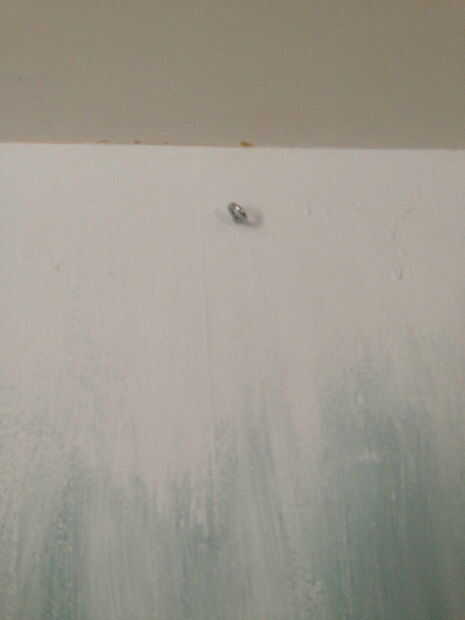 4. Atornille sus tornillos de ojo en sus marcas. Si es en pared seca Asegúrese de usar tapones de pared seca, o en lugar de tornillos del ojo he utilizado los ganchos de pared mono pero son pesados los (50 libras por lo menos).