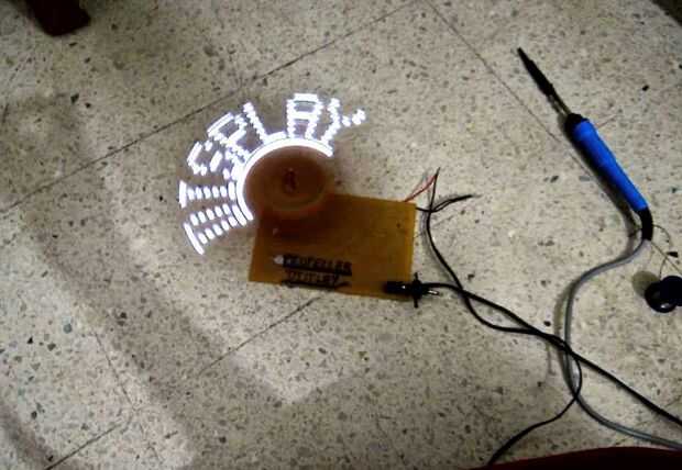 Primero de su clase, utilizando el microcontrolador 8051 de la serie de 20 pines, este proyecto uso del principio de multiplexación espacial. Esta pantalla de propulsor mecánicamente se escanea y muestra los caracteres en formato digital. De desecho que puede ser utilizado en cualquier lugar y en todas partes y el hecho más sorprendente acerca de esta pantalla es su pantalla cristalina. Esta pantalla consta de solo 8 LED brillantes que gira para mostrar la pantalla.