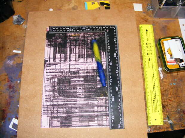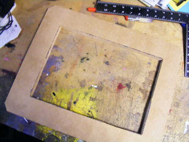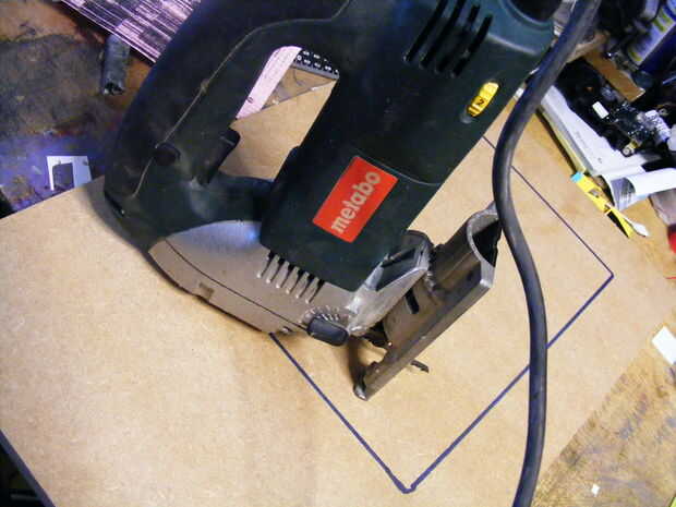 marca un 5 a 10 mm de un poco más grande que a4 rectángulo sobre el mdf. y cortar con una sierra de calar. cortar un poco de las esquinas exteriores, luego la aspiradora todo el polvo de mdf horrible.