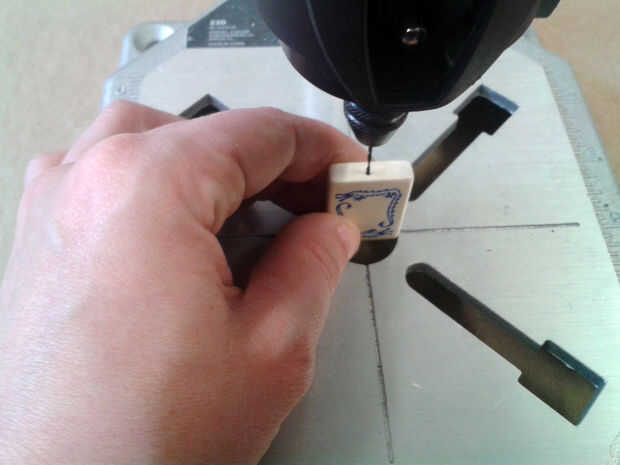 Perfore agujeros en el centro de la parte superior de cada azulejo y el centro de la parte inferior de cada teja excepto el azulejo de la parte inferior de cada cadena. El tamaño de broca que necesita dependerá del tamaño de tus fianzas - utilicé una broca de 1mm. Usted también necesitará perforar los lados en el lugar apropiado, dependiendo de donde desea vincular las cadenas. Los orificios no es necesario recorrer todo el camino, como las fianzas sólo Atornille los azulejos a corta distancia. Mientras que al menos debería intentar conseguir los agujeros rectos y en el lugar correcto, no es el fin del mundo si termina un poco apagado, así que esto es un gran proyecto para un principiante absoluto!