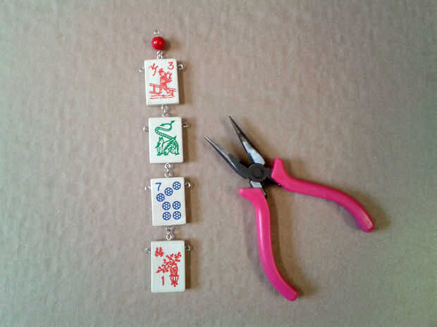 Colocar anillas en los ganchos superior e inferior y crear cadenas de azulejos. Si desea utilizar cuentas así (como yo) puede añadir a las cuerdas demasiado.