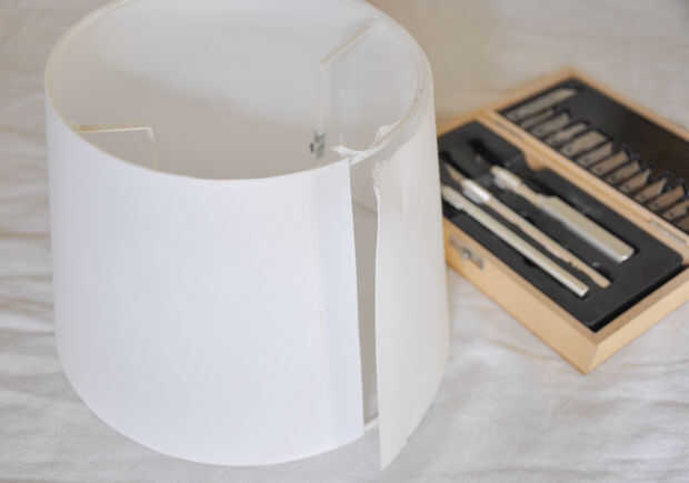 A continuación, debe quitar la cortina de la estructura de la lámpara. Usé un cuchillo del Exacto porque era más fácil, pero tijeras deben trabajar demasiado. Cuando bajé la tela de los anillos, fueron realmente pegajosas. He intentado limpiarlos apagado, pero realmente no funciona. Aunque, en realidad terminó siendo fino que eran pegajosas porque cubría de todas formas, y la viscosidad ayudó a mantener las cintas en su lugar.