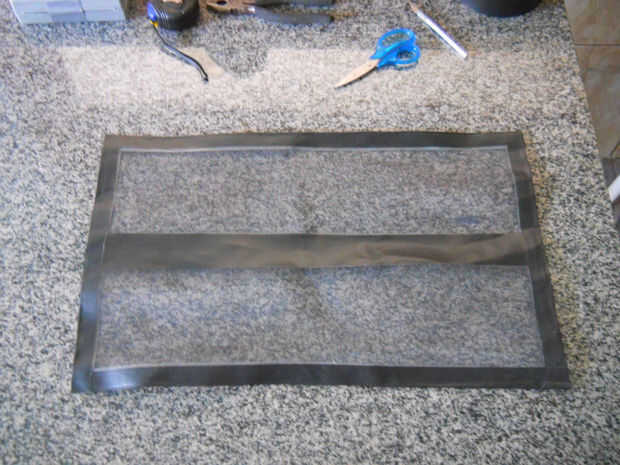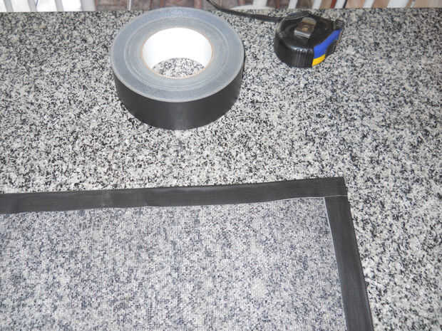 Una vez tengas la pantalla cortada a la medida, ahora vamos a crear básicamente un marco hecho de cinta colocando cada borde de la pantalla en el centro un trozo de cinta adhesiva, y luego doblar la cinta por la mitad. Esto sirve dos propósitos: evitar que la pantalla se deshilache y nos dan un marco alrededor de la pantalla para pasar chinchetas para fijar la pantalla a la ventana y el marco.