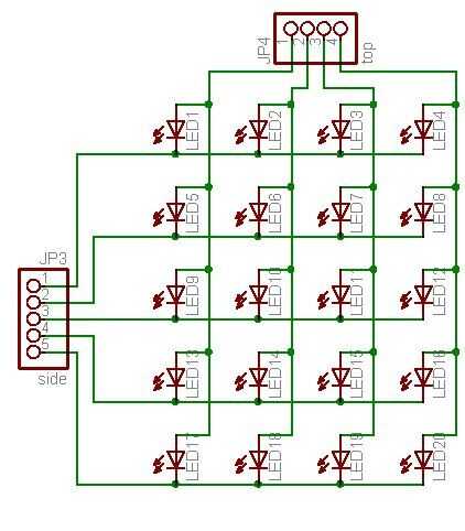 El siguiente paso fue colocar los 20 LEDs en la matriz de puntos, connectign todos los ánodos en las columnas y todos los cátodos en filas. Esto es imposible hacerlo sin utilizar cables de enlace, a menos que su uso de doble capa de tablero o tablero doble cara. No estaba así que utilizaré los cables de enlace.