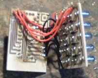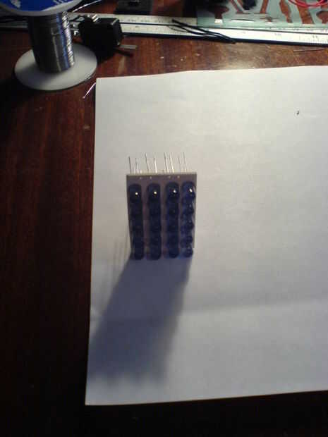 Una vez que esto fue mas empecé a soldar los LEDs, había iniciado desde la parte superior y mi camino abajo haciéndolas individualmente, hasta que me aburren y comenzó en las filas enteras a la vez. Hacia el final que se puso muy difícil el LED lidera sacó una forma. Una vez que todos los 20 LEDs fueron soldados, me atacó la parte posterior y cortado todos esos molestos plomos hasta abajo como pude. Y cierto a mis pensamientos anteriores agarró un clip repuesto 6v batería pack y batería y comenzó a correr los cables y las conexiones de iluminación de columnas. Esto parecía bastante bien en su propio, de hecho, el resto del proyecto pudo haber sido vale la pena para este look. Luego por alguna extraña razón todo filas fueron iluminando juntos pero en este punto no muy noté...