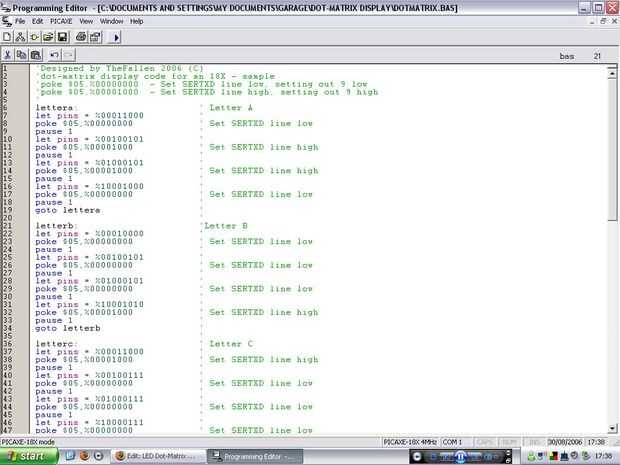 Aquellos inclinados a picking nit habrán notado que sólo hay 8 pernos en los pins = % 00000000 comando. Sí, la novena salida un PICAXE18X es de hecho la serie pasador. Esto requiere una pieza totalmente nueva de código para establecer.