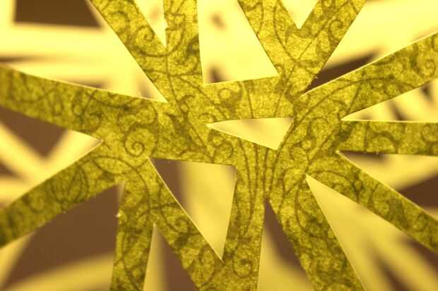 Acueste su papel sobre la superficie de corte y empezar a cortar. Usted puede cortar cualquier formas o diseños que desee. Como los estilos art decó al estilo geométrico, así que fui con triángulos. Utilizado una regla para cortar los bordes exteriores. Todo lo demás que corte a mano alzada, que puede parecer arriesgado, pero me pareció más fácil y mucho más rápido que usando la regla para cada lado de cada triángulo.
