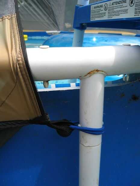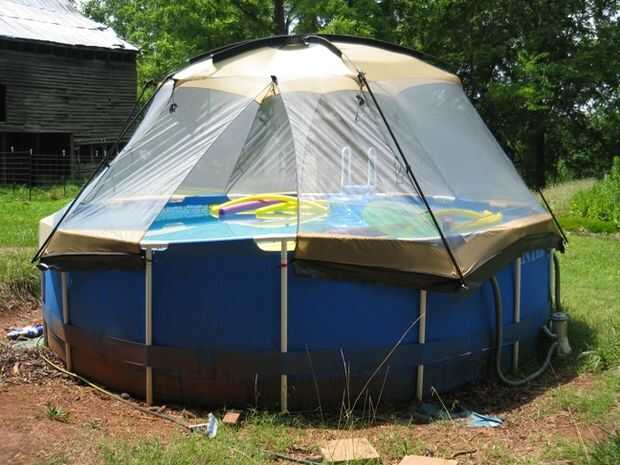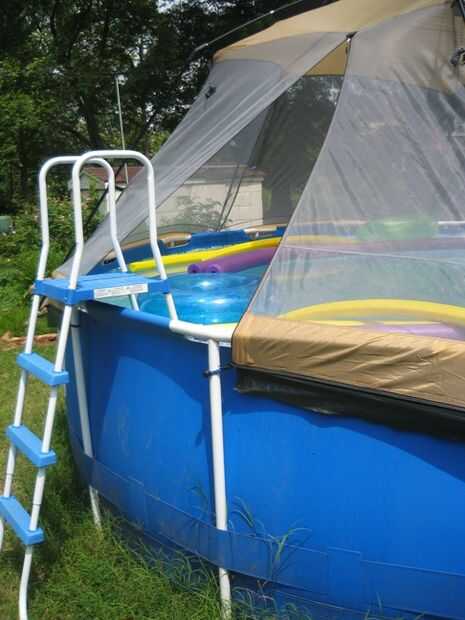 una piscina arriba de la tierra es un imán para insectos y desechos del árbol. Trató de una cubierta pero se hunde y es un dolor para quitarse y ponerse. Miró a las pantallas comerciales y el costo fue 3 x la piscina cuesta. Un día mientras que en WalMart vi un hexágono en forma de tienda de comida. Por capricho he comprado como una cubierta para la piscina. Aquí están los resultados...