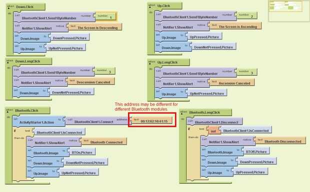 Adjunto se encuentra la fuente de Android código (archivo zip) para que pueda ver, mod y desplegar con tu ordenador vía USB. Así se une el .apk para instalar sin modificar. Actualmente puede que la aplicación personalizada para el módulo de Bluetooth. Hasta ahora no he tenido suerte consiguiendo la aplicación para seleccionar el módulo en sí así que puse la dirección de mi módulo de BT directamente. Yo no soy un experto BT así que no sé si la dirección es única para cada módulo o si dos de los mismos módulos tendrán la misma dirección. Puede encontrar su dirección de módulos en la configuración de Bluetooth o con cualquier número de aplicaciones gratuitas. Si alguna vez consigo esto funcionó subo la aplicación a la app store.