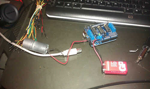 Comience conectando cables a tu motor si esto no ha sido hecho ya. Estos no necesitan ser muy largo, unas pocas pulgadas, pero es más fácil cortarlas más corta que ya más tarde, así que pecar de cauteloso. Con el escudo del motor conectado a tu Arduino, lugar uno del motor conduce a la ranura MA1 y el otro en la ranura de MA2 en el escudo del motor. Agarra uno de tu 9V (o no si es necesario) lugar el negro y pinzas de tierra, en la ranura de la GRD en el escudo y el rojo, positivo, alambre en la ranura V decc , otra vez en el tablero. Es rápido y sin dolor, o por lo que parece por eso, no hasta que haya funcionó el programa de prueba a continuación desarrolló su propio.
