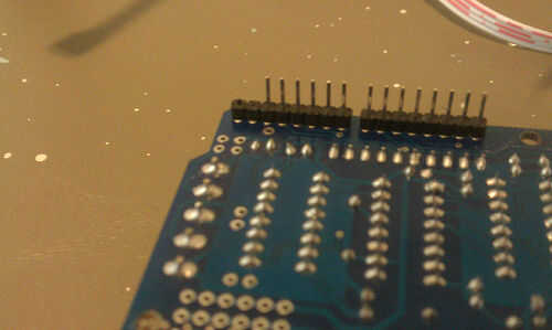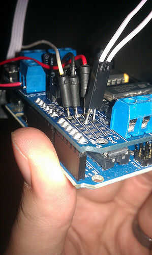 Porque compré un escudo de mucho control de motor más barato los pines no utilizados no tenían cabeceras pero, en su mayor parte, ellos estaban quebrados hacia fuera en a través de filtros de agujero en el escudo. Este fue el caso para el pin de 5 voltios, pines GND y pernos analógicos, lo que significa que simplemente tuve que soldar los cables a las conexiones, pero no los pines digitales 0 y 1 para el Bluetooth. Para acceder a los pines digitales de soldado y sacó los alfileres y luego interrumpió las cabeceras plástico corto. Esto dejó a suficiente espacio para poner un puente alambre doblado 90 º en las cabeceras de Arduino. Para la alimentación del Arduino y el módulo de Bluetooth he soldado y había conectado los cables directamente entre los componentes y el escudo. Para el potenciómetro que estará en el extremo opuesto de la barra, os adjunto jumpers corta el bote y el escudo que se conectarán con los cables de más adelante. Este enfoque me permite cambiar fácilmente la distancia entre el Arduino y el significado de olla que puedo actualizar a una pantalla más grande fácilmente en el futuro sin meterse con el Arduino.